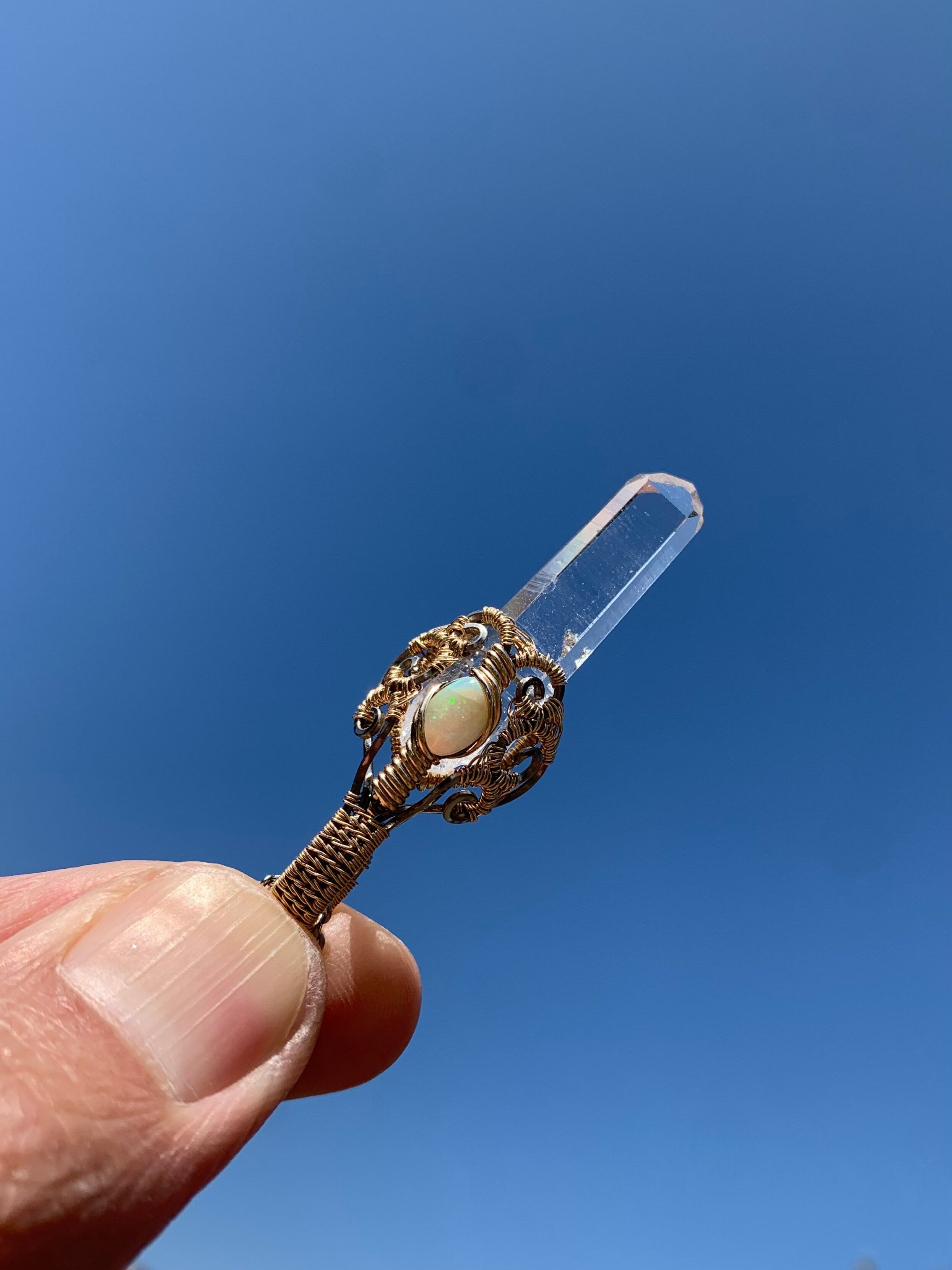 やわらかな乳白色の中に浮かぶ遊色が、澄んだ水晶の輝きに彩りを添えています